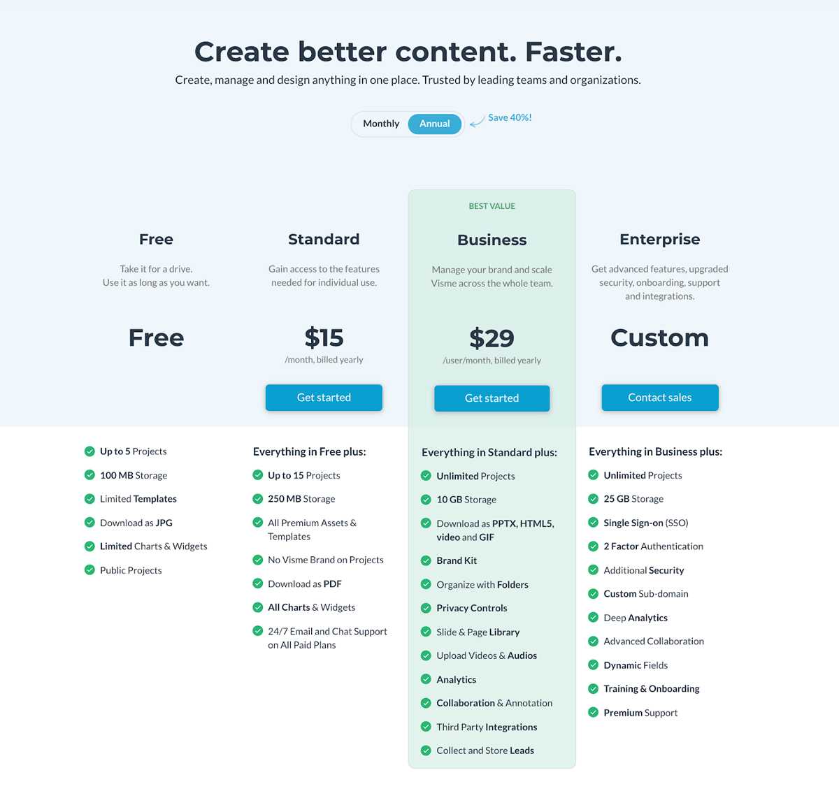 - Стандартный план с дополнительными функциями и доступом к премиальной инфографике и активам стоит 15 долларов в месяц.