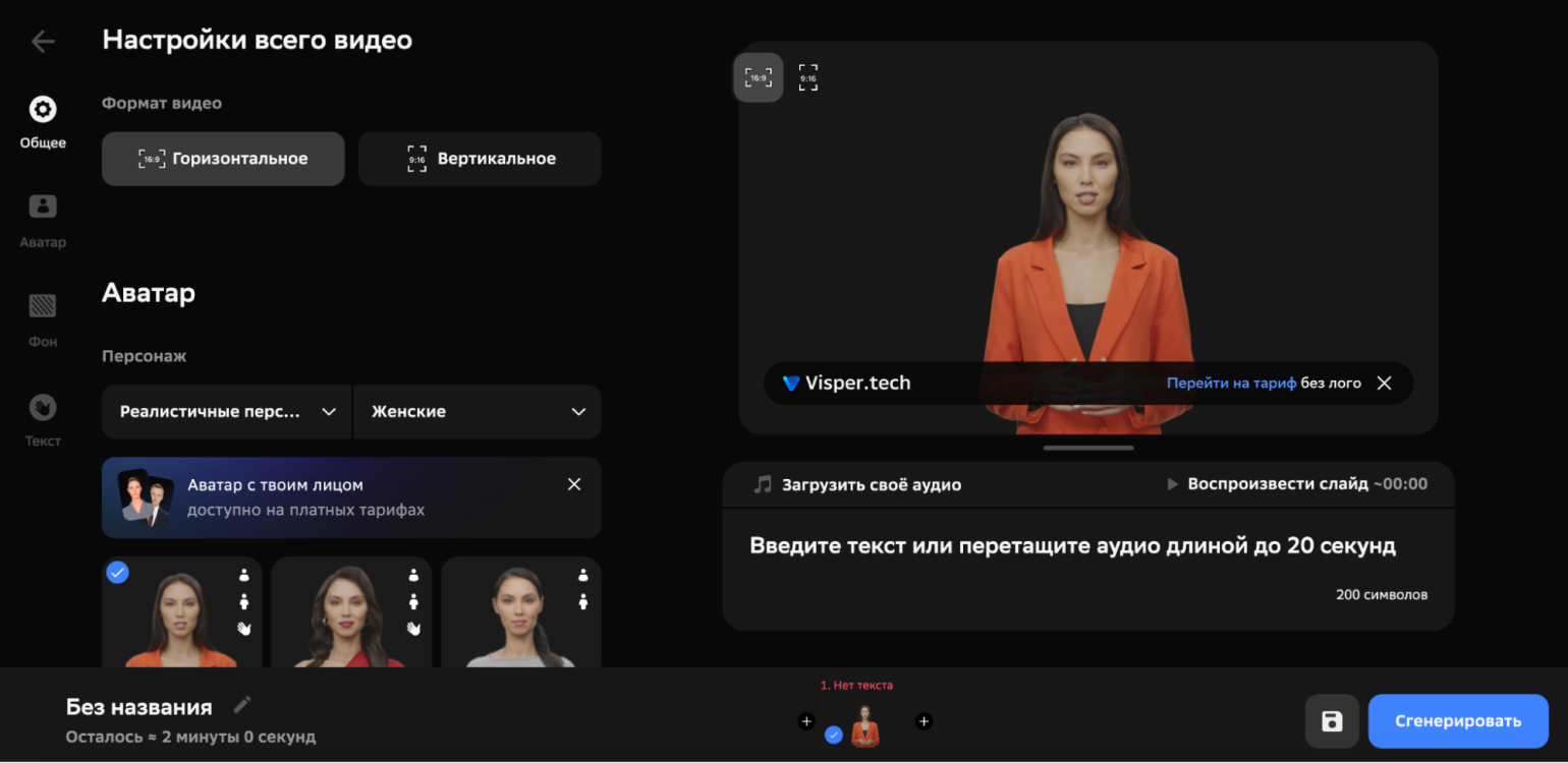 Пробная версия: бесплатно можно создавать до 50 роликов в месяц общим хронометражом до 2 минут.