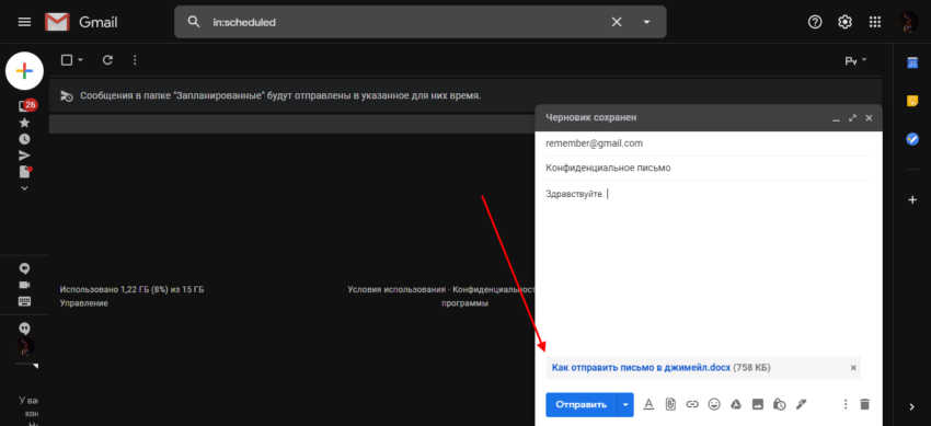 - Как только файл будет помещен в окно с письмом, произойдет его загрузка, после чего можно будет отправить письмо с прикрепленным документом.
