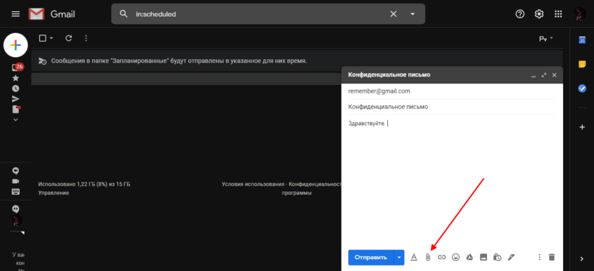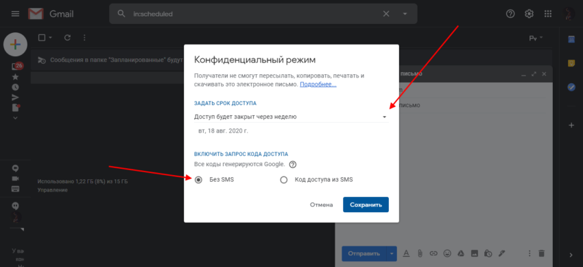 Данный режим сможет помочь в защите вашего письма от посторонних лиц. При включении режима конфиденциальности, пересылка, копирование, печать и скачивание электронного письма становится невозможным. Кроме того, вы можете поставить код на письмо и установить через какое время будет закрыт доступ. Давайте посмотрим, как это можно сделать: