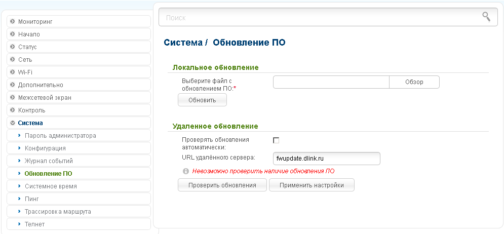 Произведенных настроек достаточно для выхода в сеть Интернет, но для более стабильной и качественной работы рекомендуется обновить версию микроконтроллера маршрутизатора. Сделать это можно в разделе «Система – Обновление ПО». Вы можете либо нажать клавишу «Проверить обновления» и маршрутизатор самостоятельно обновит прошивку до последней версии, либо скачать последнюю версию с FTP-сервера D-Link по адресу http://ftp.dlink.ru/pub/Router/DIR-615/Firmware/RevN/ и обновить прошивку вручную в пункте «Локальное обновление»: