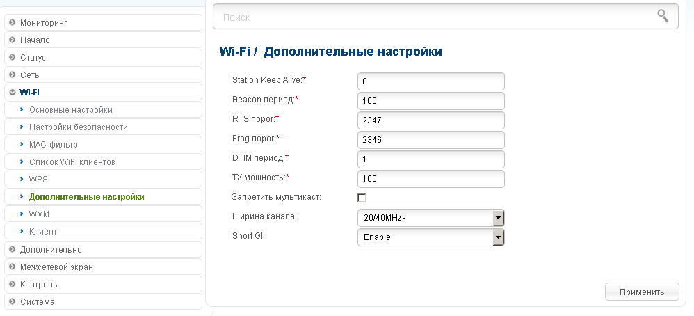 Для корректной работы беспроводной сети нужно настроить ширину канала беспроводной сети. Для этого перейдите в раздел «Wi-Fi-Дополнительные настройки» и установите параметр «Ширина канала»: – 20/40MHz-: