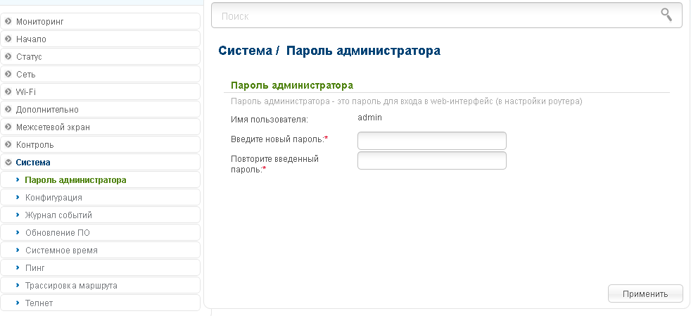 Если после этого вы захотите изменить пароль, сделать это можно в разделе «Система – Пароль администратора». Для это в поля «Введите новый Пароль» и «Повторите введенный пароль» введите новый пароль для доступа на маршрутизатор и нажмите «Применить»: