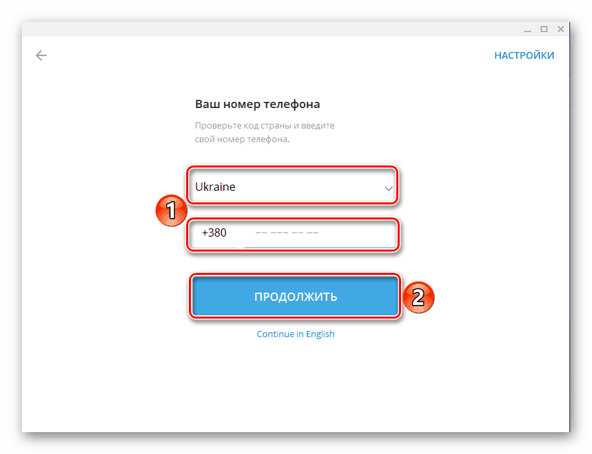 Введите код, который пришел на указанный номер мобильного или непосредственно в Телеграм, если вы используете его на другом устройстве. Нажмите «Продолжить» для перехода к главному окну.