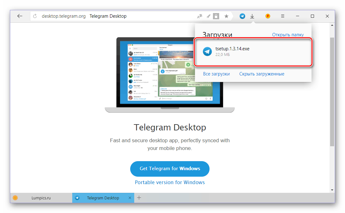 Установку ПК-версии начинают со скачивания установочного файла https://desktop.telegram.org. Его сохраняют в папке «Загрузки» или на рабочем столе. После инсталляции приложения файл установки можно удалить.