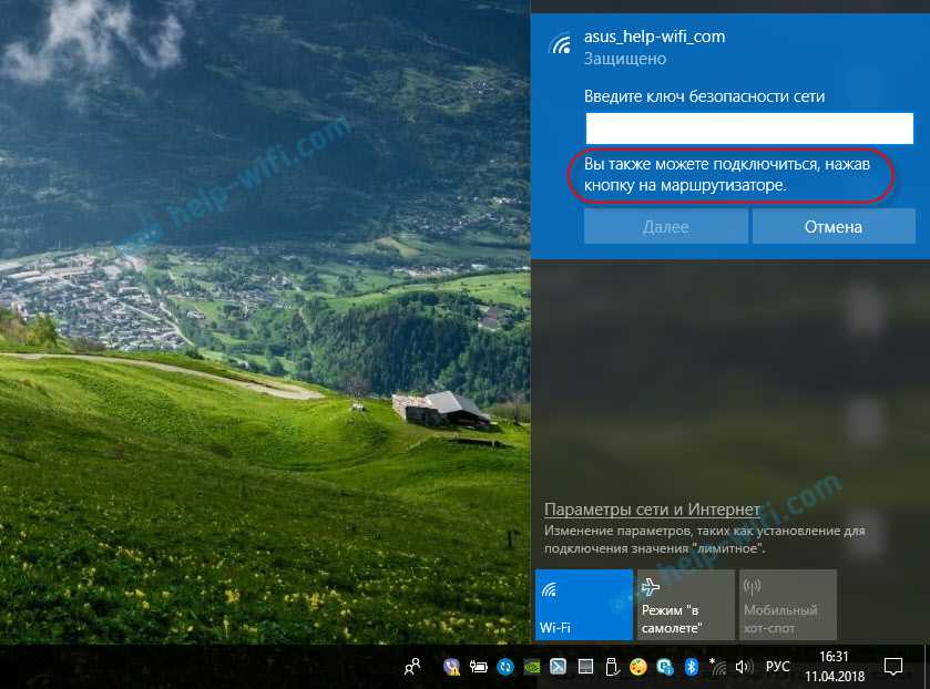 Windows 10 asks you to enter the password for the Wi-Fi to which you want to connect. Don’t do it just yet! If WPS is enabled on the router that broadcasts the Wi-Fi network, right under the password field, Windows 10 tells you that «You can also connect by pushing the button on the router.»