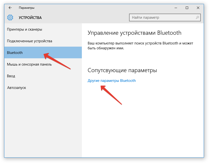 В том случае, если вы, наоборот, хотите, чтобы ноутбук обнаружился при поиске доступных Bluetooth-устройств на другом гаджете, вам потребуется открыть пункт «Открыть параметры», а затем в отобразившемся окне поставить чекбокс рядом с пунктом «Разрешить устройствам Bluetooth обнаружение этого компьютера».