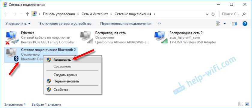 В открывшемся окне можно увидеть все доступные сетевые подключения, среди которых и значок «Сетевые подключения Bluetooth». Если радиомодуль не задействован, пиктограмма будет серого цвета, а если активен – цветная. Запустить модуль можно командой «Включить» из контекстного меню, появляющегося при нажатии на пиктограмму правой клавишей мыши или тачпада. К адаптеру в рабочем состоянии можно в любой момент подключить периферийное устройство.