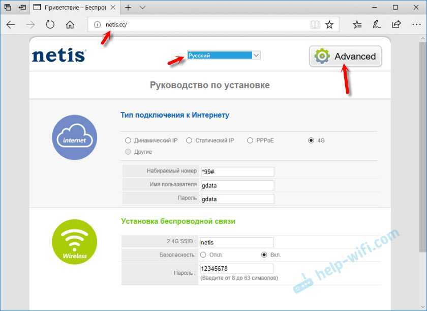 Сразу меняем язык. Как вы можете видеть на скриншоте ниже, задать настройки подключения к интернету (в том числе 3G/4G) и настроить Wi-Fi сеть можно на главной странице. Но я рекомендую нажать на кнопку «Advanced» и перейти к расширенным настройкам.