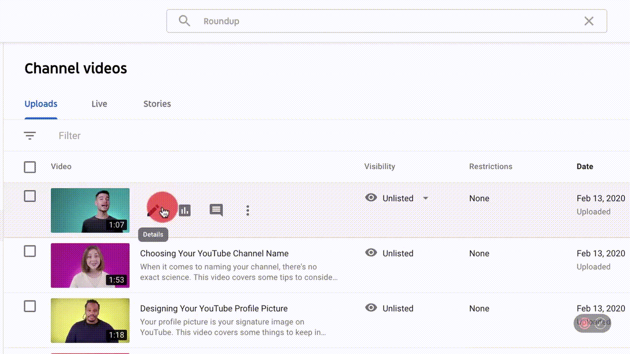 Если вы наведете на них курсор, вы увидите 4 интерактивных значка, которые позволяют редактировать детали, проверять аналитику видео, просматривать комментарии и другие параметры.