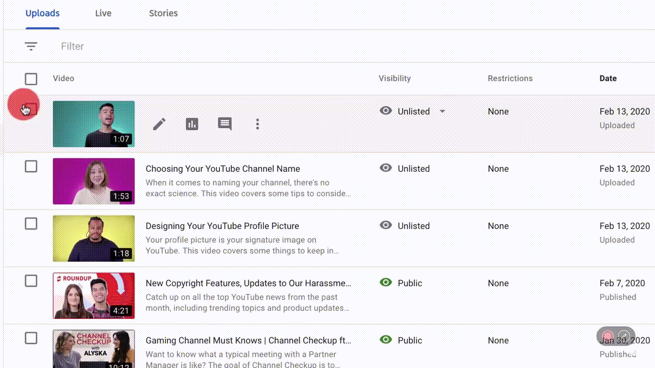 Теперь установите флажок рядом с любым видео, что позволит вам изменить название, описание, видимость и многое другое.