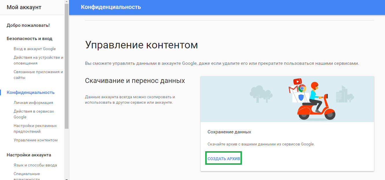 Выберите в меню опцию «Управление контентом». Найдя там активную ссылку «Создать архив», кликните по ней.