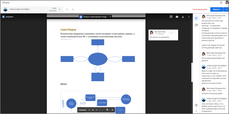Преподаватель имеет возможность отслеживать информацию о сданных/несданных работах и просматривать работу каждого студента, оставлять ему личные комментарии в специальном блоке или же оставлять примечания в самом документе. Здесь же можно выставлять оценку за работу (рисунок 3).
