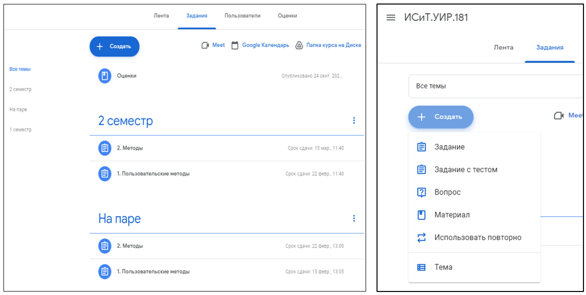 Для работы в Classroom можно создать:
