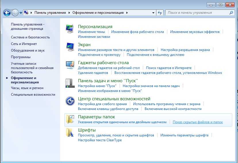 Папку, что скрыта, можно также найти и без вызова команды «Выполнить». Для этого просто зайдите в панель управления и выберите раздел про оформление и персонализацию, подраздел параметров папок. Выберите пункт «Показ скрытых файлов и папок» и откроется такое же окно, где можно менять настройки видимости.