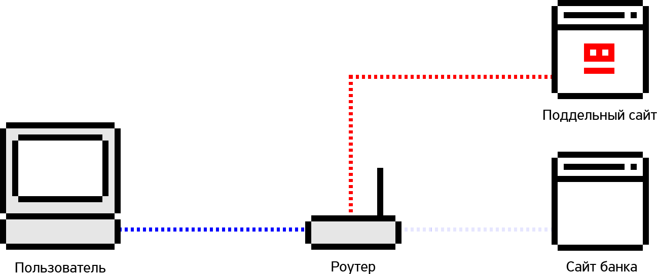 Получив доступ к панели управления, хакеры легко проведут атаку посредника: сделают так, чтобы между вами и сайтом стоял зловредный сервис, который ворует пароли. Например, по адресу tinkoff.ru будет открываться не настоящий, а поддельный сайт, который будет отправлять им всё, что вы вводите. Вы даже не узнаете, что попали на зловредный сервис: он будет выглядеть в точности как настоящий интернет-банк и даже пустит вас по вашему логину и паролю. Но при этом логин и пароль окажутся у хакеров.