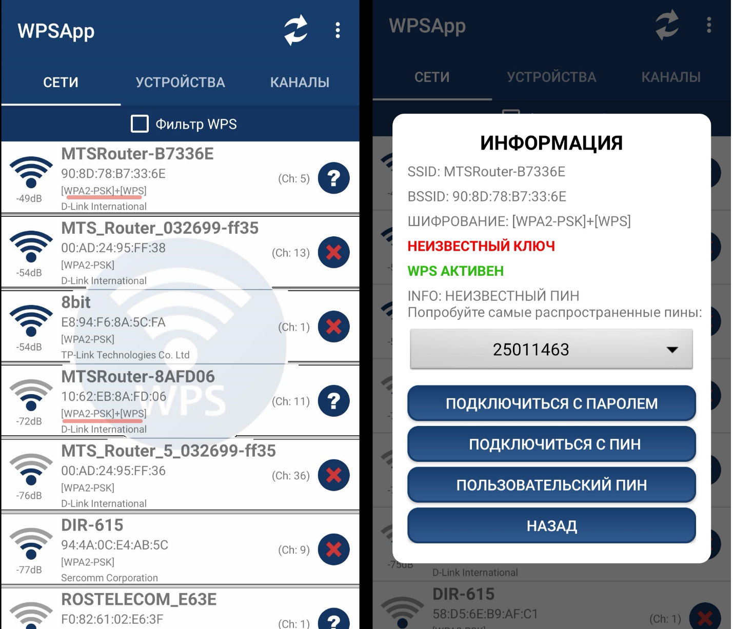 Самый первый шаг взлома сети Wi-Fi — это сканирование на наличие включенной функции WPS. Это можно сделать с телефона на операционной системе Android. Программа WPSApp не только «видит» активный WPS. На борту есть небольшая база дефолтных pin-кодов нескольких производителей (его можно узнать по MAC-адресу), которые можно попробовать автоматически подобрать. И если хакер оказывается в уверенном приеме 2-3 точек доступа с включенным WPS, то через 10-20 минут при определенной доле везения он получит доступ к одной из них, не прибегая к помощи компьютера.