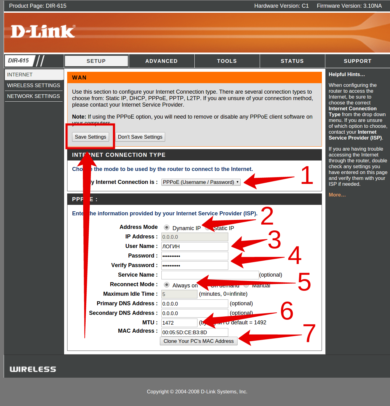 ВАЖНО: Наладка WAN-соединений производится в соответствии с данными, предоставленными поставщиком услуг Интернет