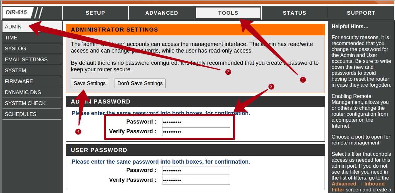 - Рекомендуется при переназначении пароля использовать серийный номер устройства (чтобы не забыть его – так как он всегда указан на корпусе). Нужно ввести пароль дважды, после чего сохранить параметры, нажав на клавишу «Save Settings». Далее попробуйте снова зайти в веб-интерфейс, но уже используя новый пароль.