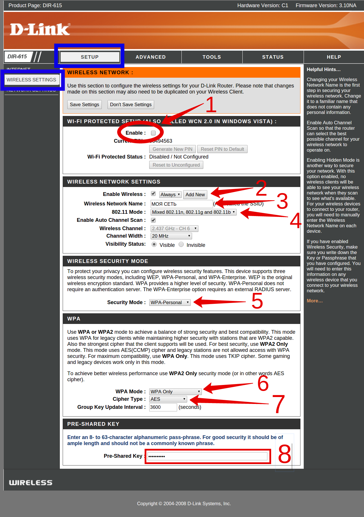 Все настройки необходимо сделать в точности так, как показано на картинке выше. В первом разделе «Wi-fi Protected Setup», будет лучше, если снять галочку «Enable», иначе, в противном случае могут возникнуть проблемы в работе с беспроводными wi-fi устройствами, поскольку не все wifi адаптеры поддерживают данную технологию.