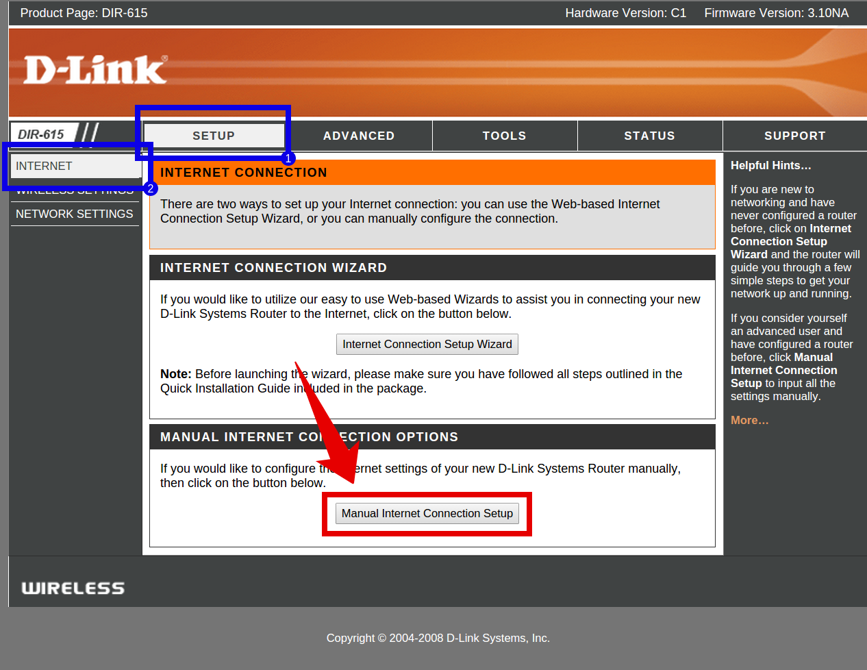 В основном меню выберите SETUP, затем в левой колонке – Wireless Settings. В открывшемся окне жмем на кнопку Manual Wireless Connection Setup.