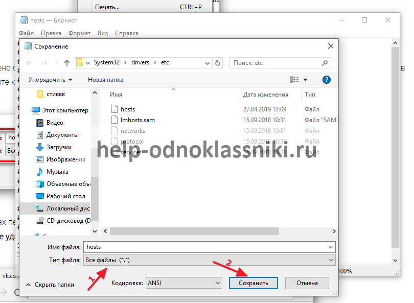После этого нужно сохранить получившийся файл, выбрав в «Типе файла» пункт «Все файлы». Название файла при этом менять не нужно. Если все было сделано корректно, то после всех этих действий зайти на сайт «Одноклассников» получится без проблем (в том случае, если проблема действительно скрывалась в файле hosts).