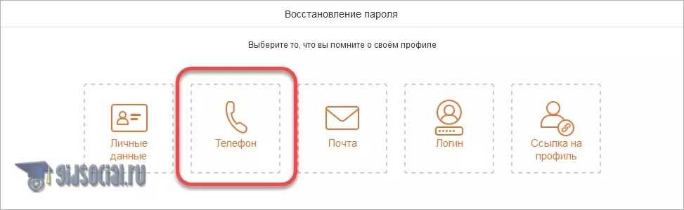 - Далее выберите способ восстановления пароля. Это могут быть: личные данные, телефон, почта, логин или ссылка на профиль. Мы будем использовать именно телефон.