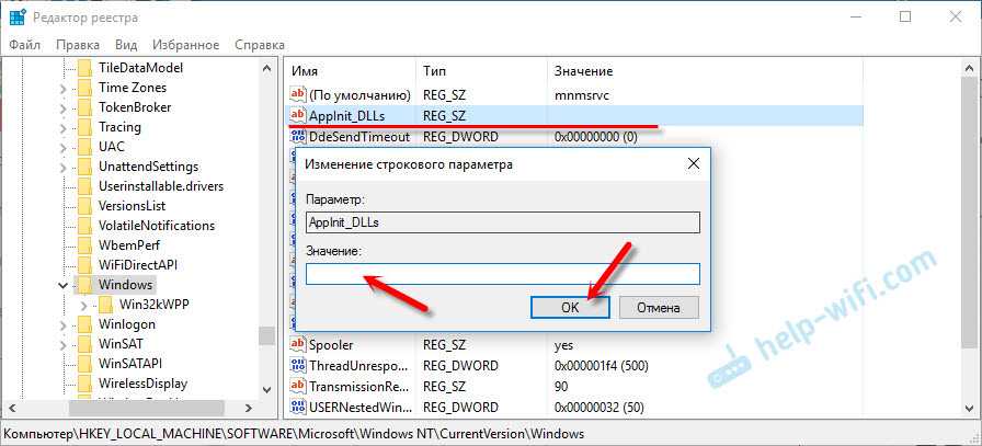 В окне слева будут разные параметры. Нас интересует параметр AppInit_DLLs. Нужно, чтобы значение этого параметра было пустым. Если у вас там что-то прописано, то двойным нажатием на параметр AppInit_DLLs открываем его, удаляем все из строки “Значение”, и нажимаем Ok.