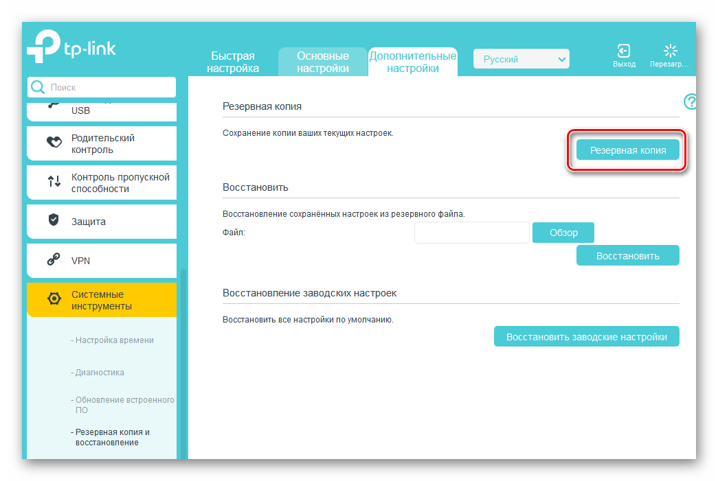 - Перед началом действий по обновлению вшитой микропрограммы на роутере, входим в веб-интерфейс девайса, открываем дополнительные настройки, далее следуем в блок системных инструментов и нажимаем на графу «Резервная копия и восстановление».