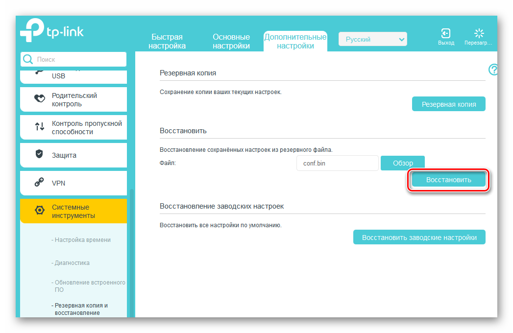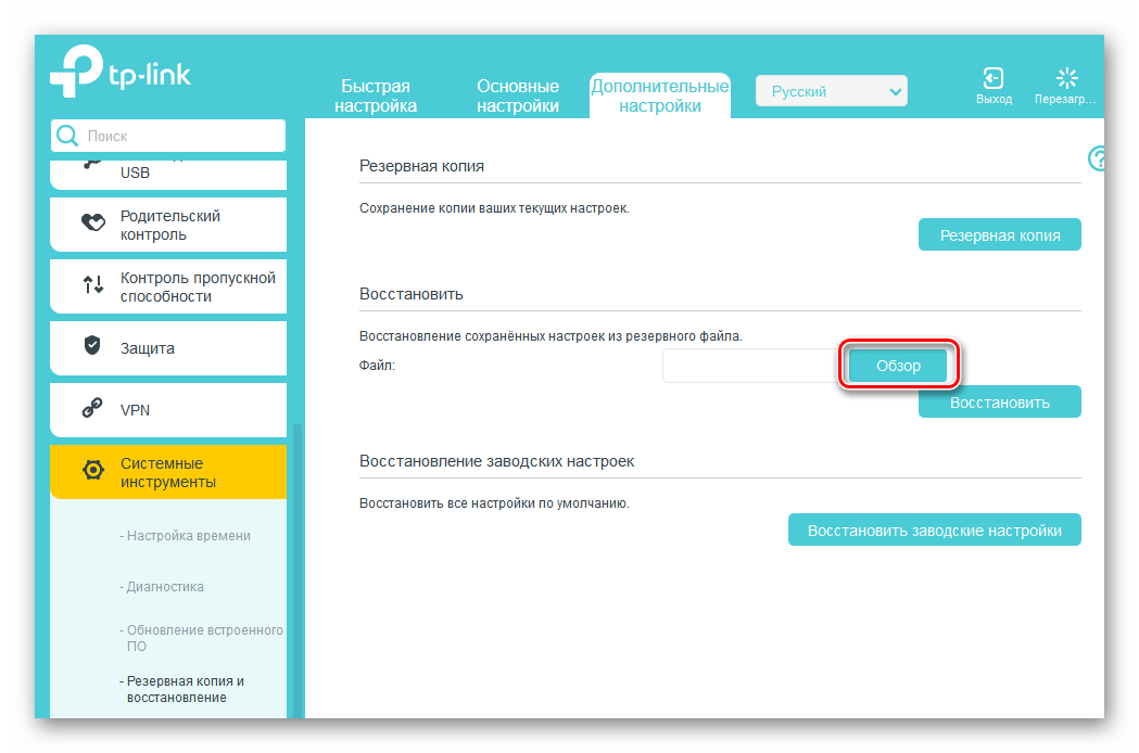 Опять открываем веб-клиент роутера, добираемся до меню системных инструментов и раздела «Резервная копия и восстановление». В блоке «Восстановить» находим «Обзор».