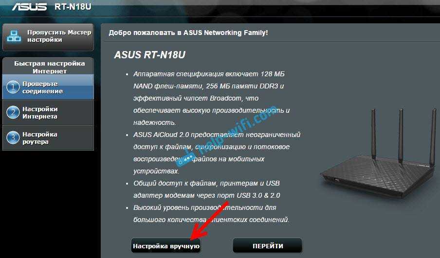 В главном окне, нажмите на кнопку Настройка вручную. Если выбрать Перейти, то роутер попытается сам определить тип вашего подключения. Но, он не всегда успешно это делает. И что бы не запутаться, лучше настроим вручную.