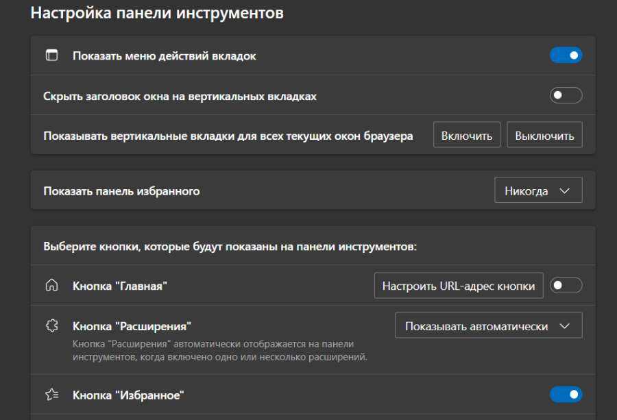 - Настройка панели инструментов — дает возможность выбрать какие из элементов будут на ней отображаться, при каких условиях должна быть активна панель избранного, а также позволяет выбрать — активировать вертикальные вкладки или нет.