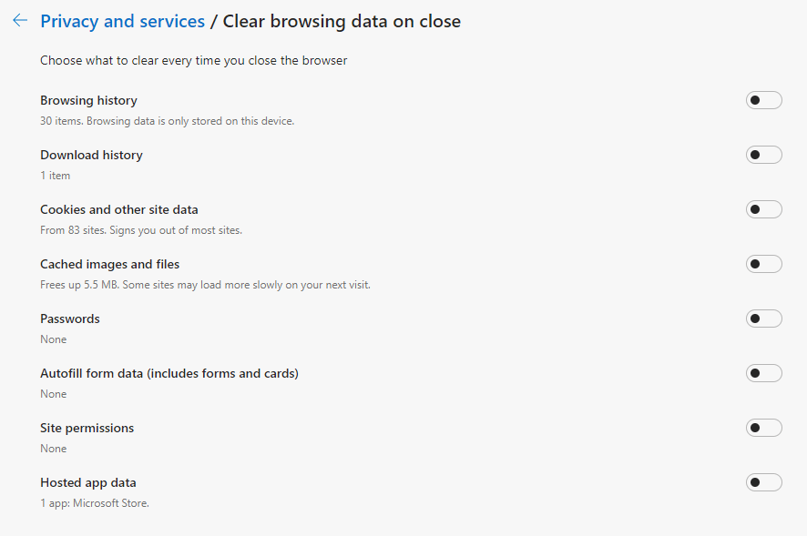 Tap on “Choose what to clear every time you close the browser” option in the “Privacy and Services” section. Here you will see a bunch of options on the list, including browser history, download history, Cookies and other data, Passwords and more. Toggle ON all those options whose data you do not wish to keep each time you shut down the Edge browser.
