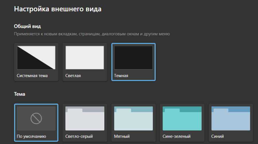 Общий вид — позволяет выбрать фон открытых вкладок, страниц, диалоговых окон и иных меню, сделав его темным, светлым или зависимым от глобальной настройки операционной системы Windows. Другими словами, в браузере теперь есть полноценный темный режим.