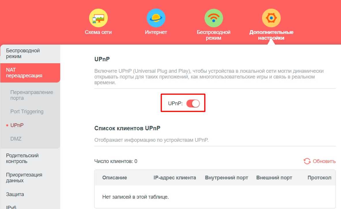 Также смотрите, чтобы была включена функцию UPnP – она позволяет автоматом открывать и закрывать порты.