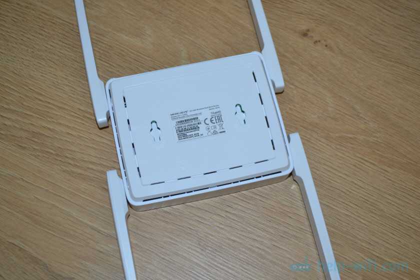 Роутер можно без проблем повесить на стену (в корпусе есть необходимые отверстия). А снизу вы найдете небольшую наклейку, на которой указана полезная информация об устройстве. В том числе заводской пароль от Wi-Fi сети, имя сети и адрес для входа в настройки. Эта информация пригодится нам при настройке роутера.