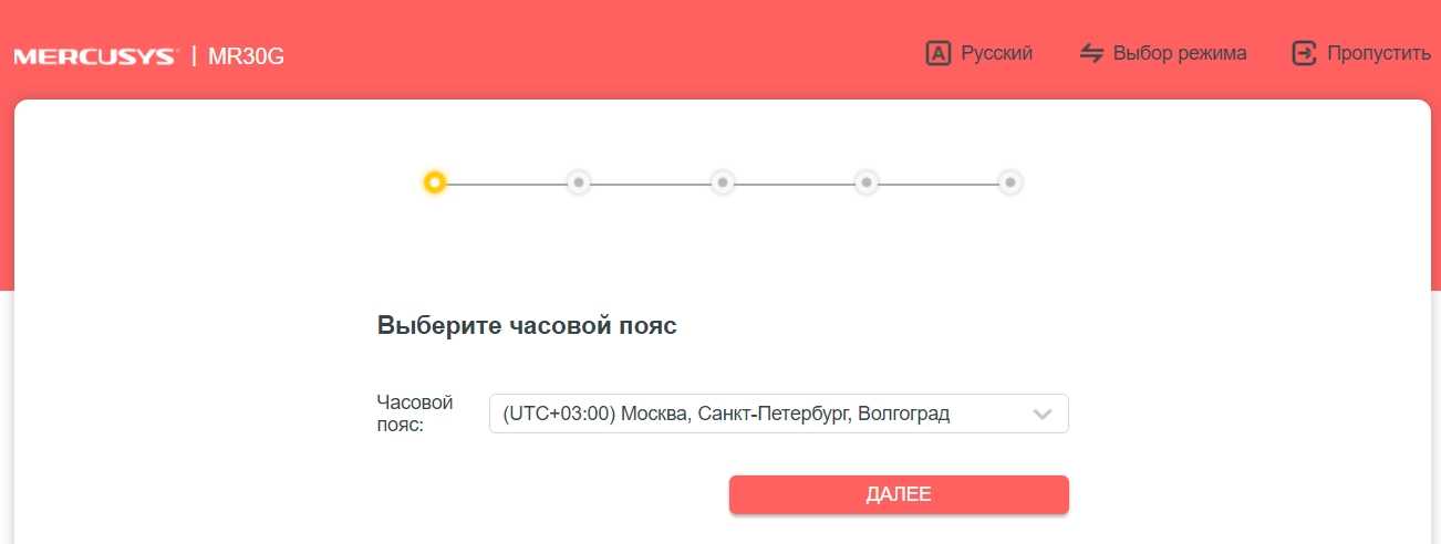- Выбираем часовой пояс. Вы можете сменить язык или выбрать другой режим работы сверху (Точка доступа, WISP, повторитель). Или вообще пропустить быструю настройку и настроить интернет и Wi-Fi вручную. Я же буду настраивать маршрутизатор стандартным способом.