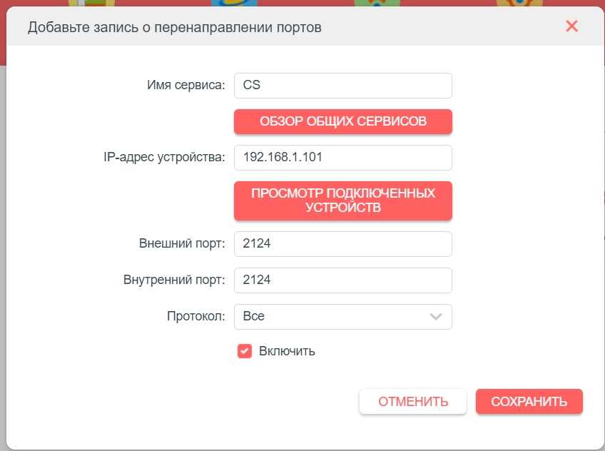- Имя сервиса – любое название. Можно указать имя игры, программы или устройства. Можно также посмотреть, какие сервисы уже есть, нажав на кнопку «Обзор общих сервисов». В таком случае номера портов автоматически подставятся.