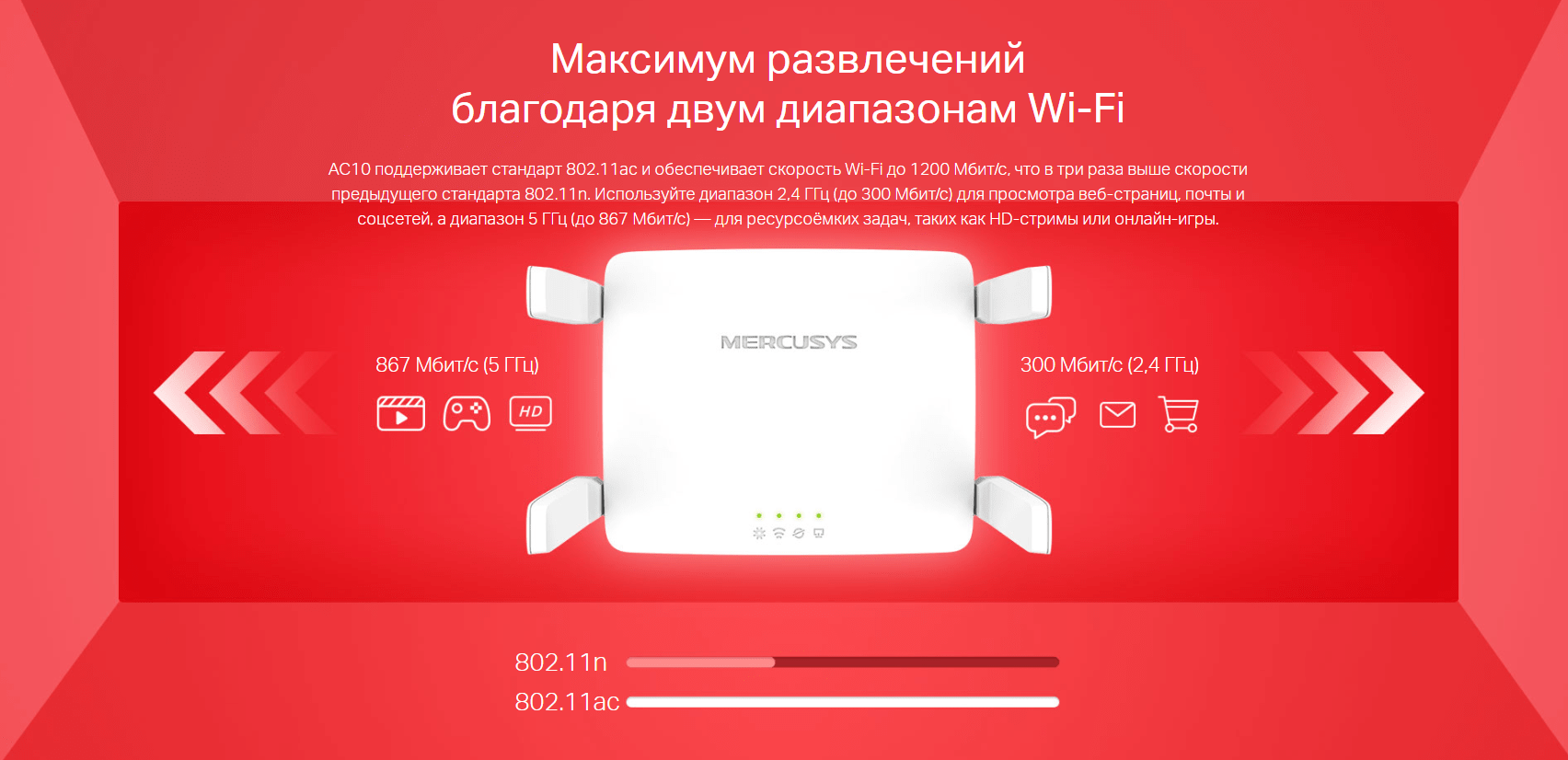 Wi-Fi роутер Mercusys AC10 обладает поддержкой стандарта Wi-Fi 5 (802.11ac), что позволяет достичь скорости передачи данных до 1200 Мбит/с. Такая высокая скорость позволяет с легкостью стримить видео высокого разрешения, скачивать файлы и играть в онлайн-игры без задержек.