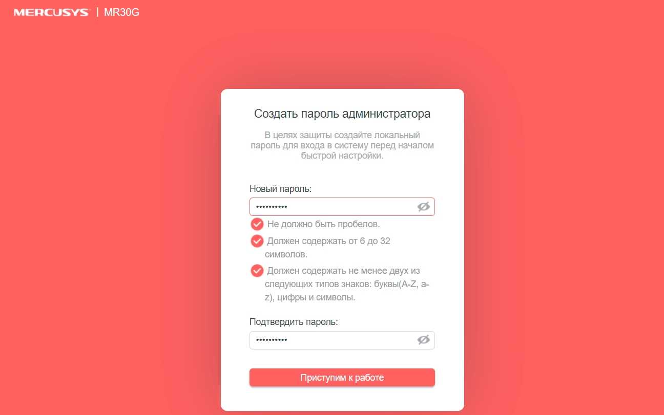- Придумываем и два раза вводим пароль от администратора. На новых моделях логина нет. Будьте внимательны, так как разработчики почему-то решили усложнить пароль символами и буквами верхнего и нижнего регистра. Не забудьте, а лучше куда-нибудь запишите этот ключ – без него в настройки вы не попадете.