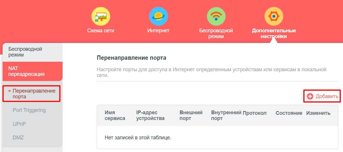 Заходим в «NAT переадресацию» и далее выбираем «Перенаправление портов». Кликаем по крестику для добавления правила.