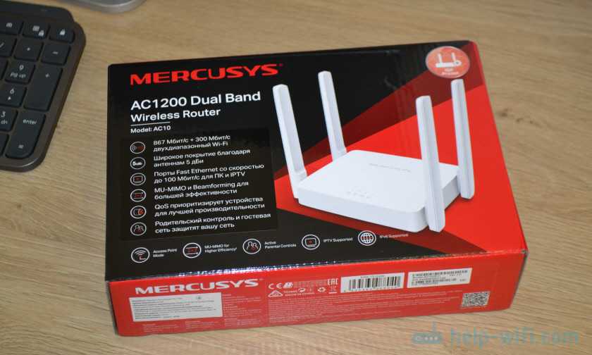 Mercusys AC10 поставляется в небольшой картонной коробке черно-красного цвета. Кроме изображения роутера на коробке можно найти технические характеристики данной модели, информацию о поддерживаемых технологиях и функциях.