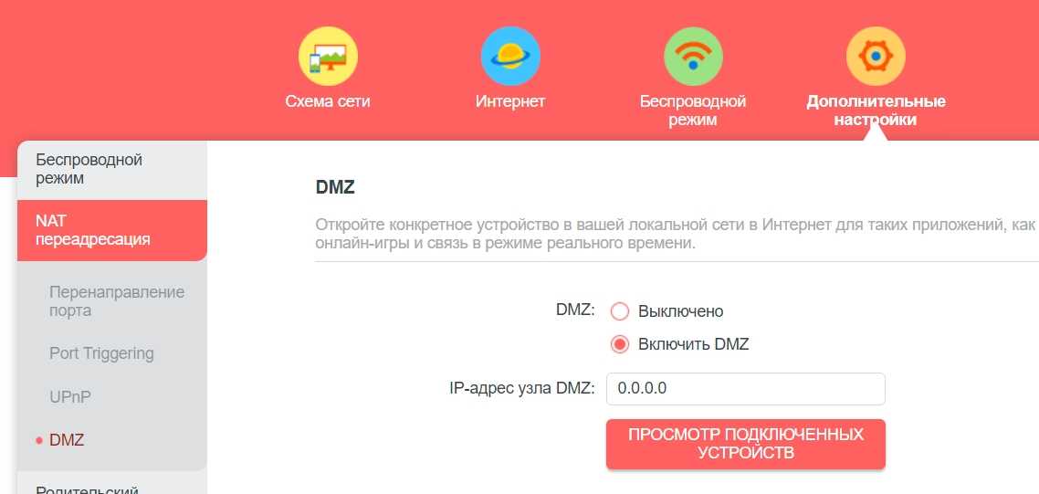Если же вы хотите открыть все порты для какого-то устройства и сделать его открытым для интернета, то можно занести его в зону DMZ. Просто включаем функцию и добавляем наше устройство. Очень полезно, если у вас дома стоит выделенный игровой, FTP или любой другой сервер. Но помните, что в таком случае вам в некоторых моментах придется настраивать Firewall на этой машине (например, открытие портов для определенных служб).