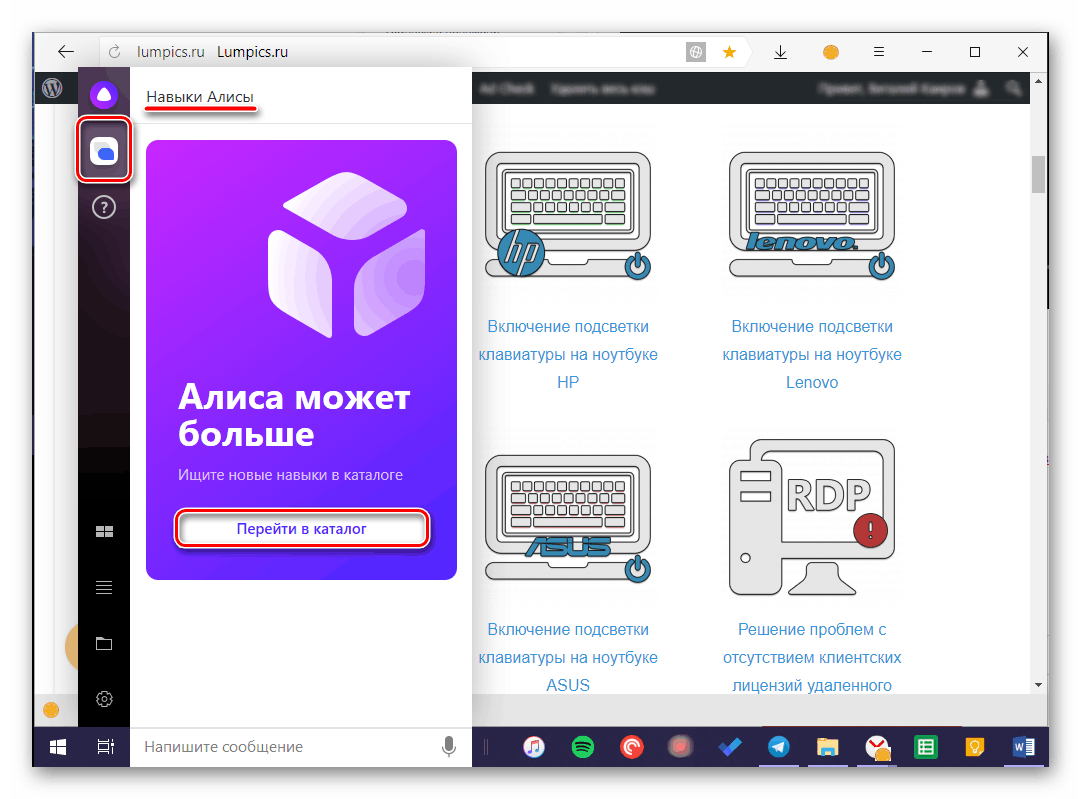 Базовую функциональность голосового помощника можно расширить – для этого следует перейти во вкладку «Навыки Алисы», затем нажать по виртуальной кнопке «Перейти в каталог», выбрать и установить подходящее дополнение.