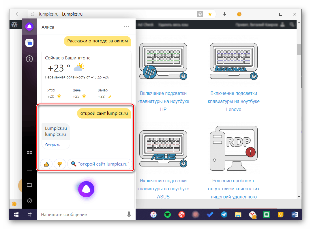Алису можно попросить открыть сайт, просто озвучив или написав его адрес. Запуск произойдет в веб-обозревателе, используемом на компьютере в качестве основного, то есть это не обязательно должен быть Яндекс.Браузер.