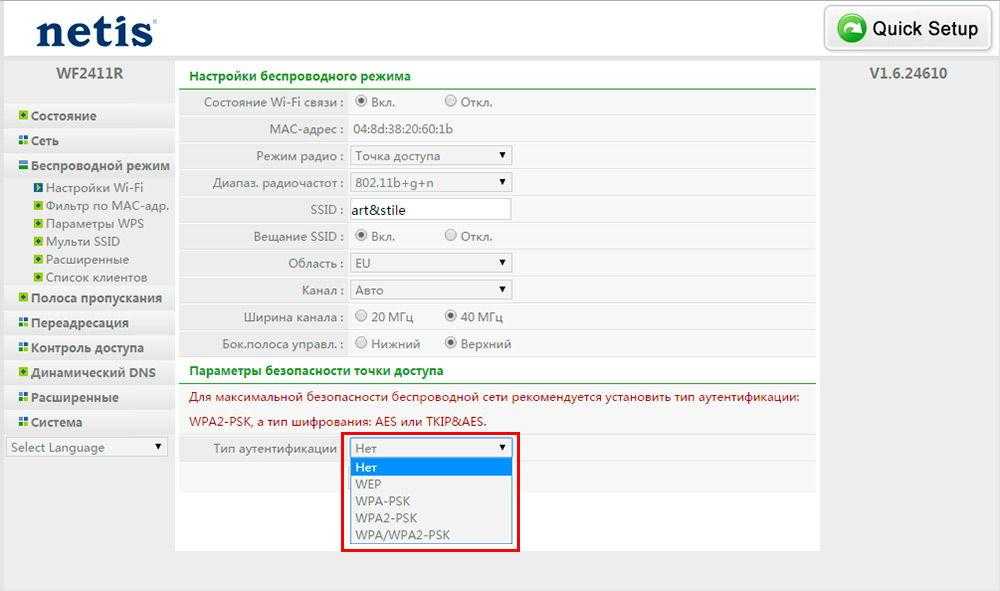 Если в разделе «Wi-Fi» установлен режим «n», «auto» или «ac», то следует ввести «802.11 b / g». Такая мера помогает, если ошибка аутентификации связана с тем, что старый и недорогой телефон или планшет не поддерживает современный способ передачи сигнала.