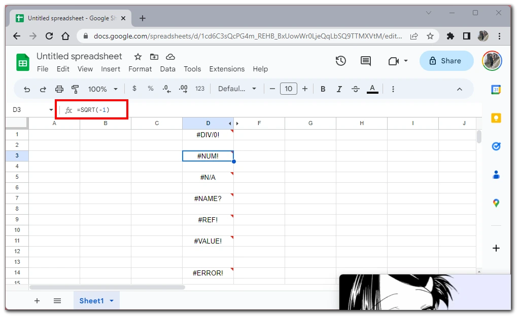 Ошибка #NUM! указывает на ошибку числового значения в формуле. Например, если в формуле вида «=SQRT(-1)» вычисляется квадратный корень из отрицательного числа, то возникнет эта ошибка.