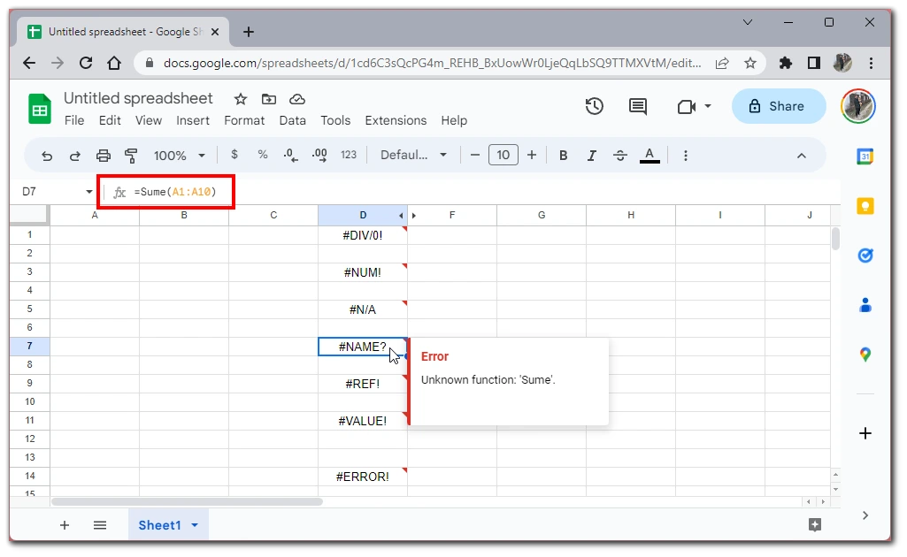 Ошибка #NAME? указывает на то, что формула содержит нераспознанное или неправильно написанное имя функции или диапазона. Например, если ошибочно ввести функцию SUM в виде «=SUme(A1:A10)», то возникнет ошибка.