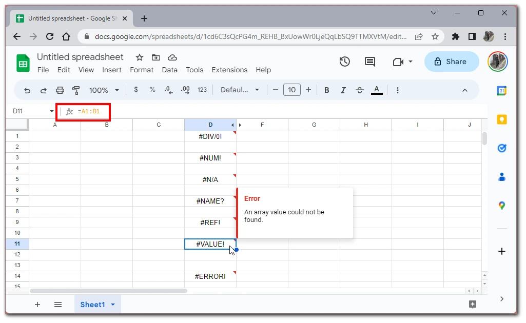Ошибка #VALUE! указывает на проблему с типом данных, используемых в формуле. Например, ошибка возникнет, если в формуле «=A1:B1» одна из ячеек диапазона содержит нечисловые данные.