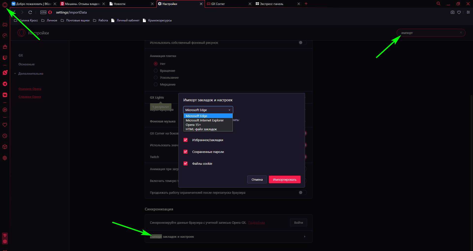 Для сохранения настроек запускаем ПО, нажимаем на логотип в верхнем левом углу, заходим в настройки (сочетание клавиш Alt+P) и через поиск находим «Импорт закладок и настроек». Затем выбираем браузер для переноса данных и нажимаем «Импортировать».